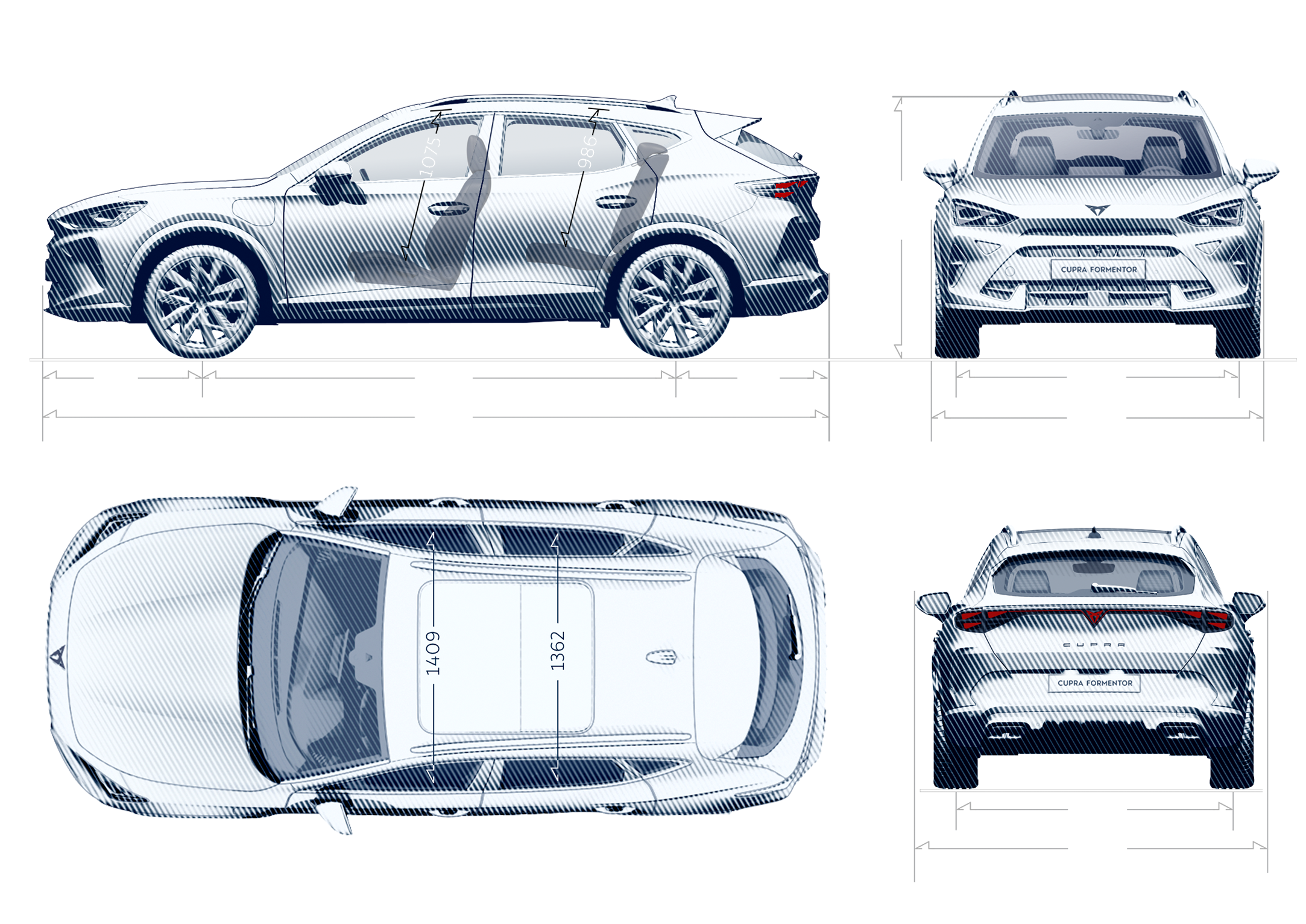 | Dimensions vary depending on engine type. Engine specifications vary from country to country. Please consult the Efficiency Labelling for each engine according to your local requirements. The values mentioned are the result of the type approval of the selected model, in accordance with Regulation CE 2018/858. ¹ Maximum power determined according to UN GTR.21, available for max. 30 seconds. ² The dimensions shown in the image apply to the engine 1.5 TSI 150HP¹ (110kW) mHEV 7-Speed DSG (Automatic) ³Estimated value considering a charge between 10% and 80% using a 50 kW DC outlet. The charging time of your vehicle may vary due to multiple factors, including but not limited to weather conditions, the age, and the condition of the battery. Accordingly, the charging time provided should not be interpreted as an exact measurement, but rather as a general estimate. This information is for guidance purposes only and does not constitute a guarantee of charging performance. The accurate range for your vehicle will vary according to a number of different factors which include the route, weather conditions, vehicle load (occupants + luggage), optional equipment (alloys, tyres, etc.), the use of peripheral energy consumption systems such as heating, air conditioning and heated seats, as well as your driving style. The indicated range has been calculated in compliance with the WLTP regulation which sets out standard test conditions applicable to all car manufacturers. This ensures that the values calculated in accordance with this regulation are comparable for all vehicles. |